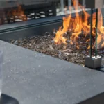 Feuer-Glas ist gehärtetes, gefärbtes Sicherheitsglas. Es reflektiert Wärme, erzeugt ein brillantes, modernes Erscheinungsbild und bietet viele Farben. Es ist teurer als Lavastein und sollte regelmäßig gereinigt werden.